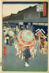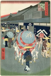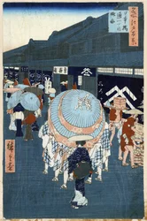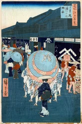 Ansicht von Nihonbashi Tori-itchome, aus der Serie "Hundert berühmte Ansichten von Edo"(View of Nihonbashi Tori-itchome (Nihonbashi Tori-itchome ryakuzu), from the series "One Hundred Famous Views of Edo (Meisho Edo hyakkei)")Utagawa Hiroshige |
