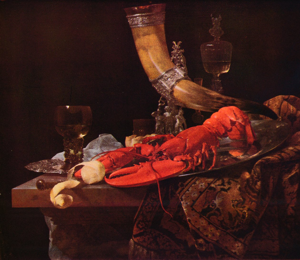 ende oben · nahrung · getränk · innen · zuhause · nacht · dunkel · spiritus · farbe · farbe · hummer · wein · tabelle · eßbare meerestiere · jahrhundert · nach innen · dreißiger jahre · möbel · weinglas · nahaufnahme · zeit · 17. jahrhundert · publikation · trinkgefäß · wasserleben · dreißiger jahre · 20. jahrhundert · still life · willem kalf · kalf · willem · studio publications · The Print Collector/Heritage Images