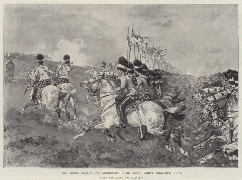 Die Drill-Saison in Aldershot, die Scots Greys greifen Kanonen an(The Drill Season at Aldershot, the Scots Greys charging Guns )William Barnes Wollen |