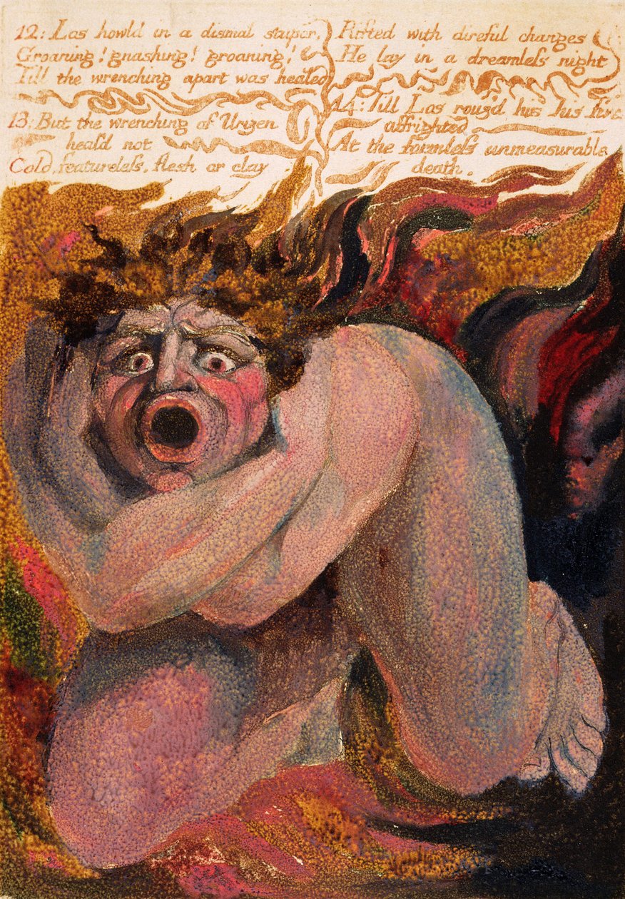'12: Los howld in a dismal stupor...', Platte 10 aus 'Das erste Buch Urizen', 1794('12: Los howld in a dismal stupor...', plate 10 from 'The First Book of Urizen', 1794 (colour-printed relief etching with ink and wc))William Blake |