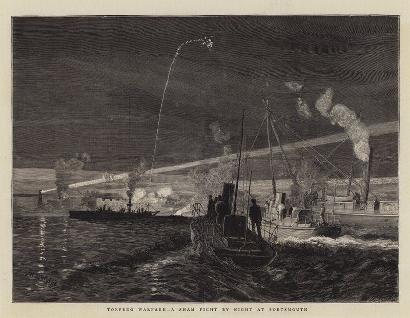 Torpedokrieg, ein Scheinangriff bei Nacht in Portsmouth(Torpedo Warfare, a Sham Fight by Night at Portsmouth )William Lionel Wyllie |