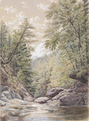 natur · fluß · szenisch · baum · landschaft · betrieb · betriebe · künste · anstrich · felsen · felsen · gebirgsstrecke · new york · land · kunst · museum · geographie · schlucht · nebenfluß · landschaft · position · jahrhundert · konzept · watercolor · watercolour · gouache · catskill · catskills · catskill berge · vereinigte staaten von ameri · farbe · getroffen · metropolitanmuseum der kunst · das metropolitanmuseum der kunst · 19. jahrhundert · 19.jahrhundert · amerikanisch · bäume · amerika · landscape · heritage art · kaaterskill clove · kauterskill clove · hudson river school · catskill clove · kaaterskill · and graphite on light green wove paper · william rickarby miller · miller · william rickarby · Heritage Art/Heritage Images