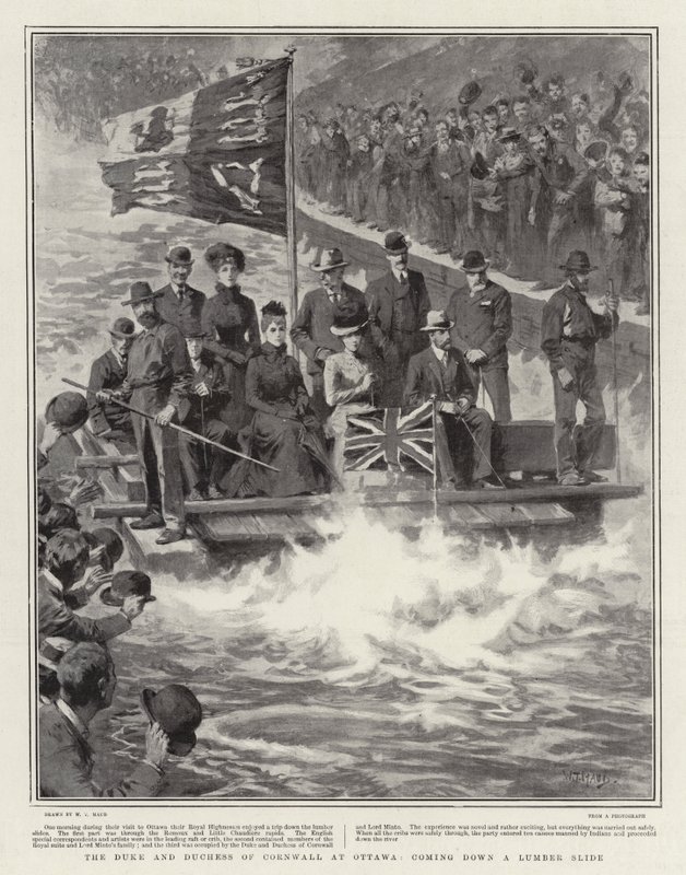 Der Herzog und die Herzogin von Cornwall in Ottawa, die eine Holzrutsche hinunterfahren(The Duke and Duchess of Cornwall at Ottawa, coming down a Lumber Slide )William T. Maud |