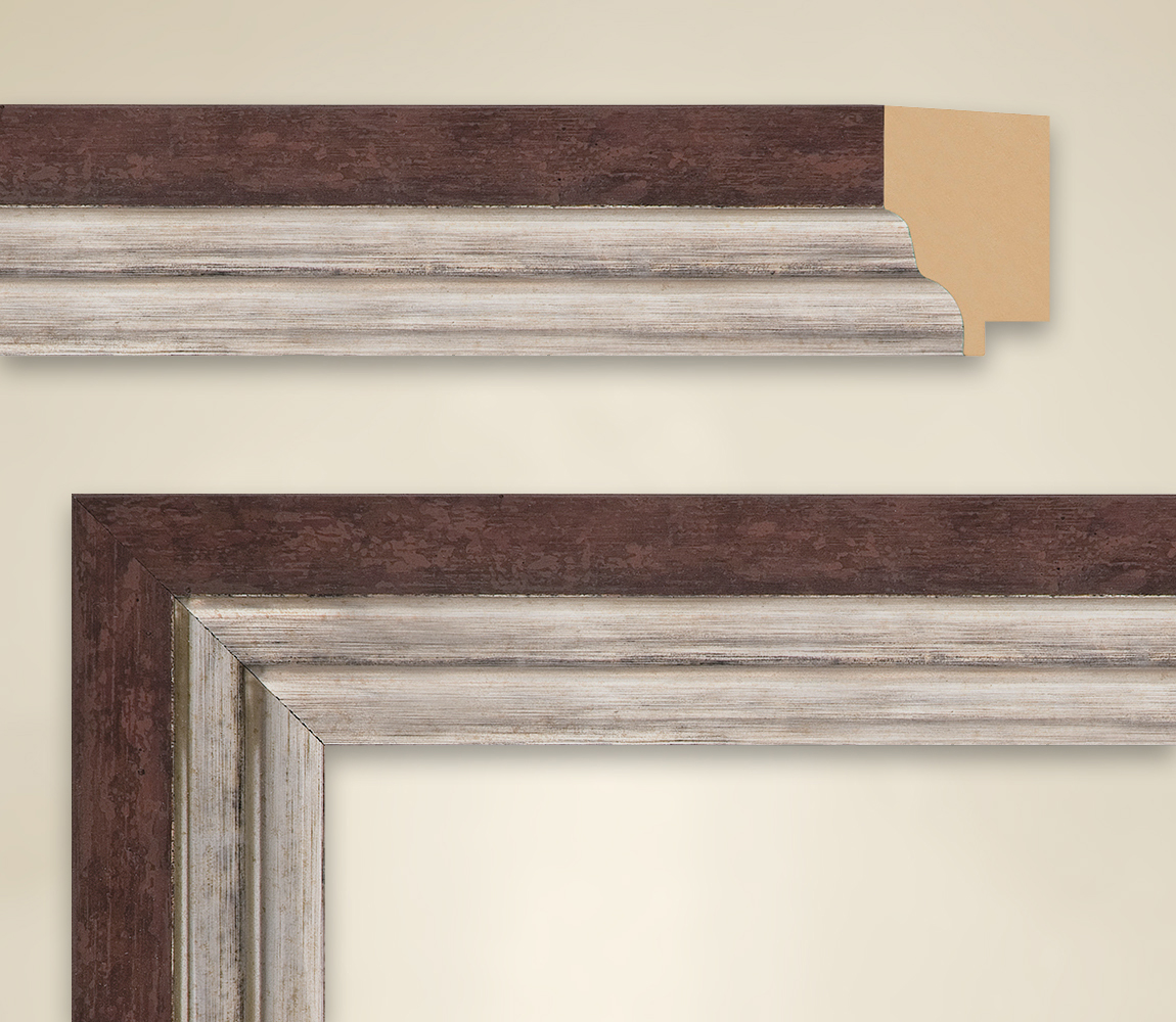 | Bei der Gestaltung des Bilderrahmens Emilia scheint ein Künstler selbst am Werk gewesen zu sein. Sowohl bei der Formgebung als auch bei der Wahl der Farben, in denen dieser Echtholzrahmen gehalten ist, wurden künstlerische Aspekte ganz vorn angestellt. In den Maßen wurde er auf eine Breite von 52 Millimetern gebracht und in der Höhe auf 40 Millimeter. In dieser Höhe ragt Emilia mit der obersten dicken Leiste in den Raum hinein. Diese rechtwinklige, glatte Leiste ist in einem Braun gezeichnet, das durch eine spezielle Oberflächenbearbeitung verschiedene Nuancen aufweist. Wie mit einem Schwamm aufgetragen und wieder verwischt sind helle und dunkle Brauntöne nebeneinander, übereinander, wild durcheinander vermischt. Diese Leiste bekommt künstlerische Unterstützung von den zwei folgenden Leisten. Beide sind gleich groß und wölben sich mit Rundungen nach außen, was einen weichen Kontrast zur kantigen Braunleiste ergibt. Hier wurde noch einmal kreativ angesetzt - auf silbernem Grund kommen noch einmal farbige Effekte zum Einsatz und bringen weiteren Schwung in den Rahmen Emilia. |